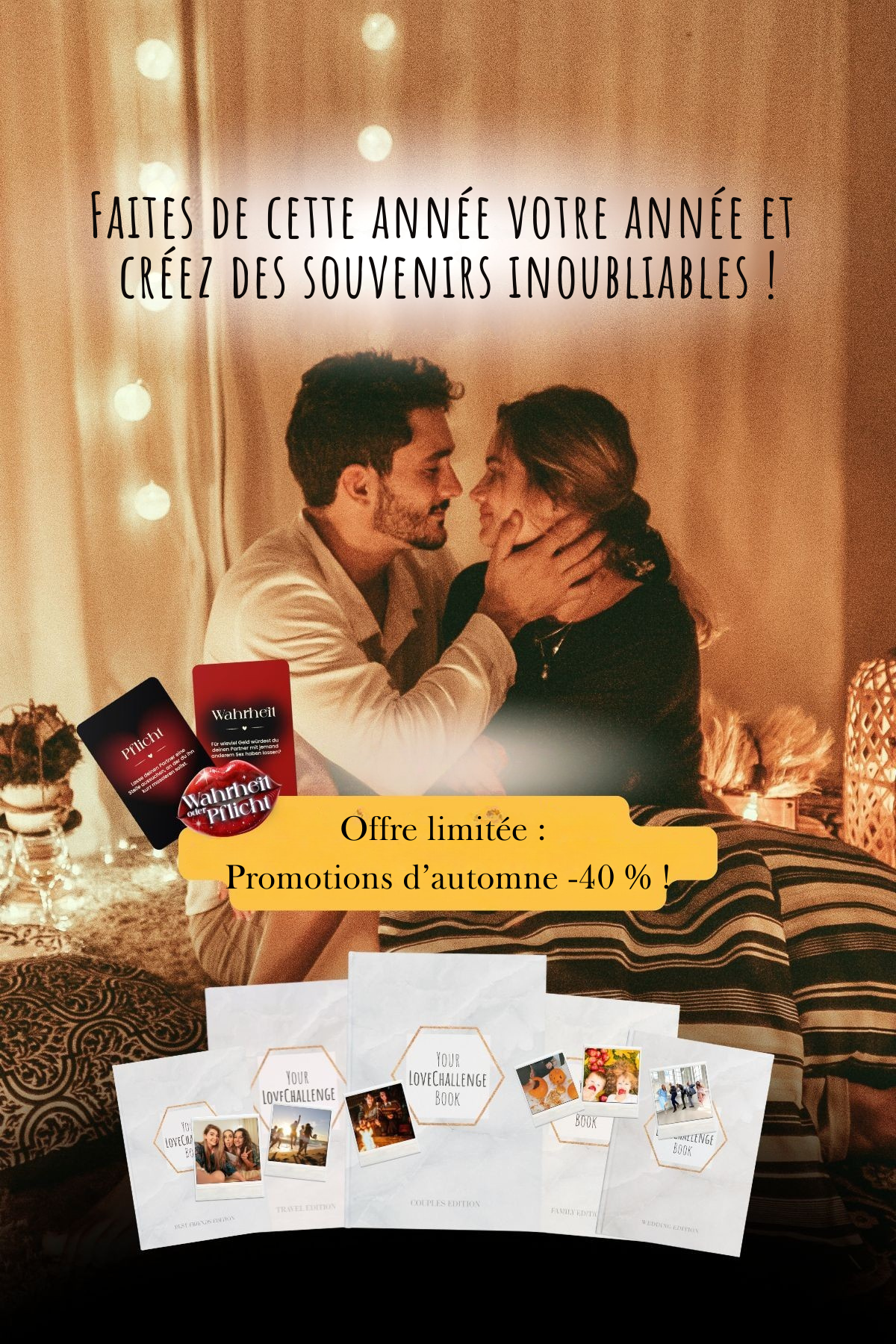 Bienvenue chez YourLoveChallenge ! Evelin et Daniel, les fondateurs, vous proposent de vivre des moments inoubliables – la recette secrète pour des relations interpersonnelles enrichissantes. Nos livres proposent une multitude de défis pour les couples, les amis, les familles et les voyageurs, afin de renforcer chaque relation et de vivre de nouvelles expériences. Découvrez ensemble de nouveaux horizons et créez votre livre de souvenirs 💖