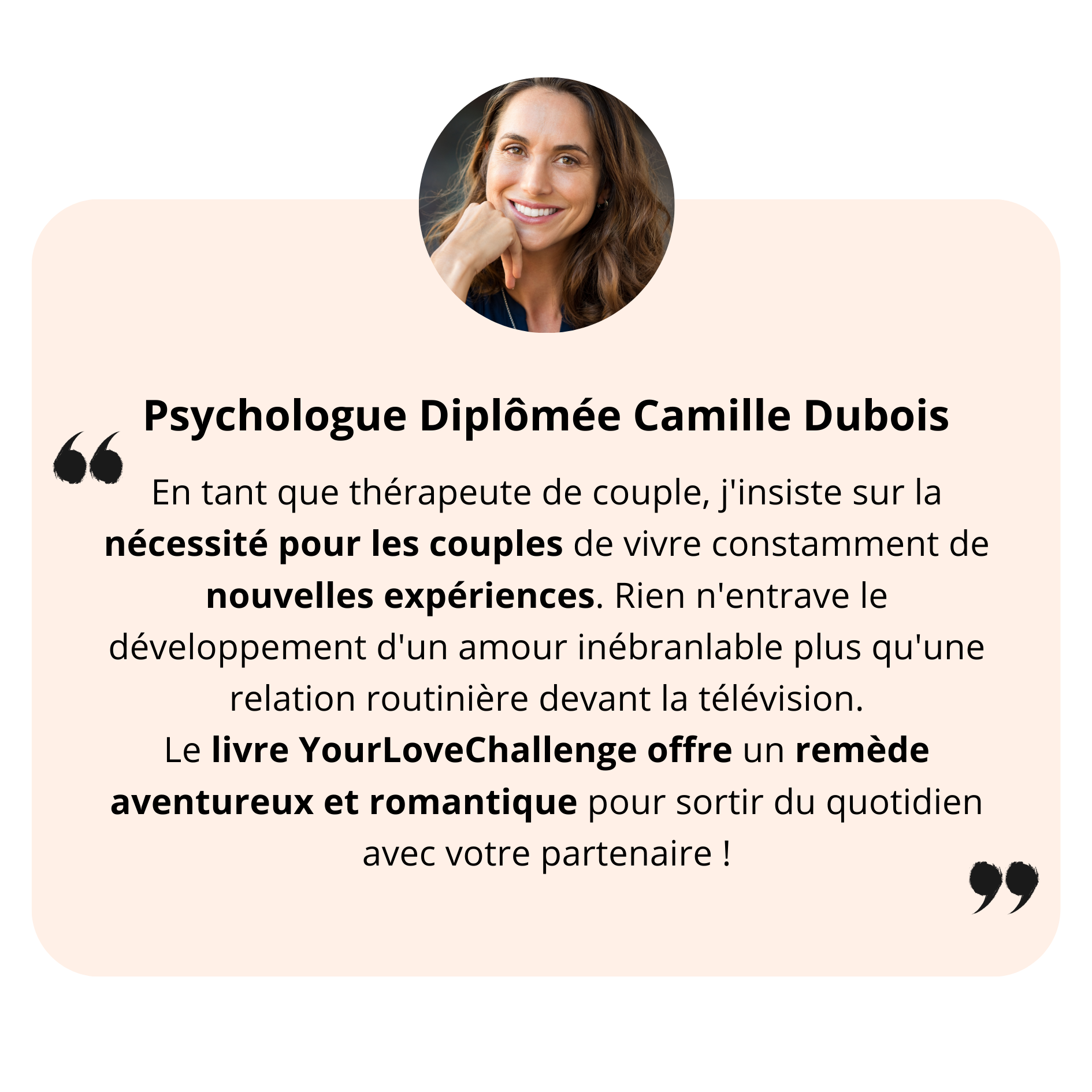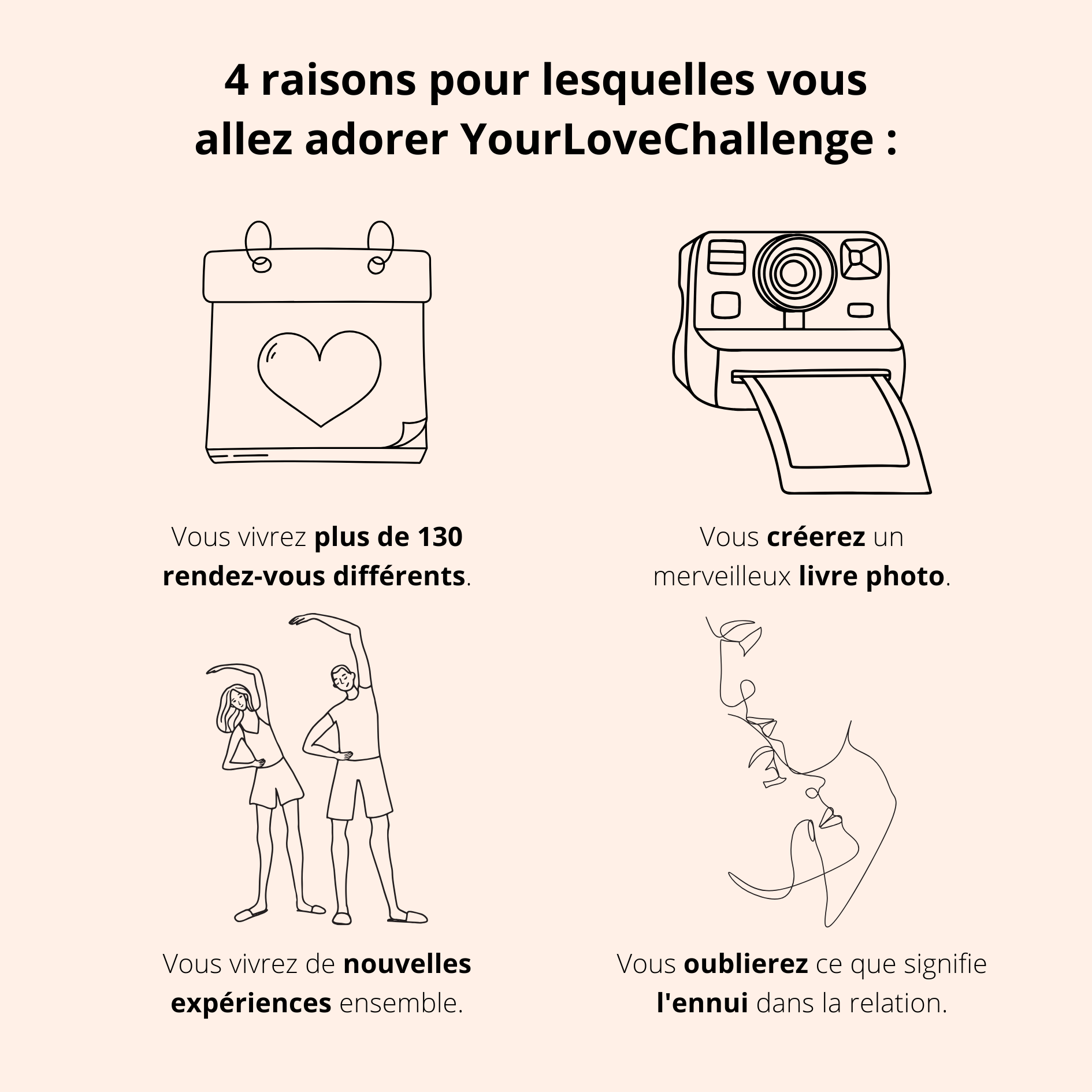 "YourLoveChallenge a redonné vie à notre relation et nous a enrichis de plaisir, d'idées et de proximité. Un incontournable pour chaque couple, merci !"