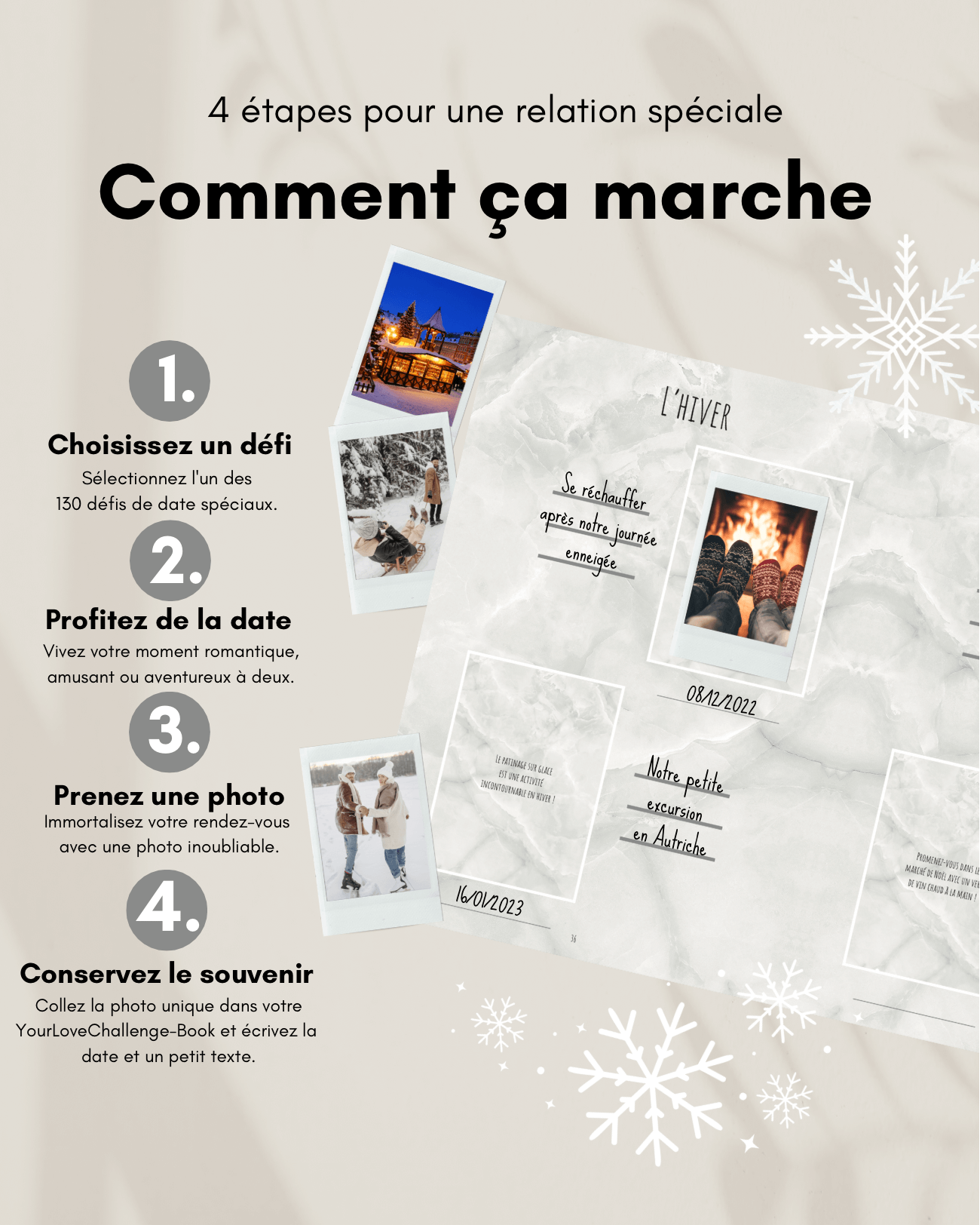 Bienvenue chez YourLoveChallenge ! Evelin et Daniel, les fondateurs, vous offrent des rendez-vous surprenants et des souvenirs inoubliables - la recette secrète pour la complicité que tout le monde désire. Nos livres de défis sont remplis d'idées variées pour enrichir votre relation et favoriser l'intimité. Découvrez ensemble de nouvelles facettes et créez votre livre de souvenirs 💖